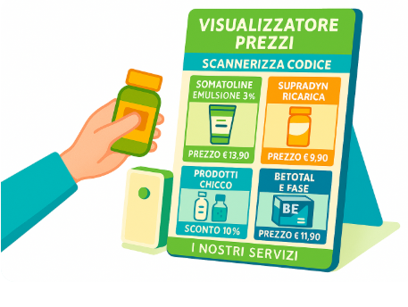 Pensato per adattarsi a diversi formati di schermo (tablet o totem), il Visualizzatore Prezzi mantiene un layout pulito e coerente su ogni dispositivo, garantendo una grafica uniforme e un uso ottimale dello spazio disponibile. Il sistema può essere personalizzato a livello grafico per integrarsi perfettamente con l'identità visiva della farmacia e supporta la promozione di servizi aggiuntivi attraverso sezioni dedicate e dinamiche